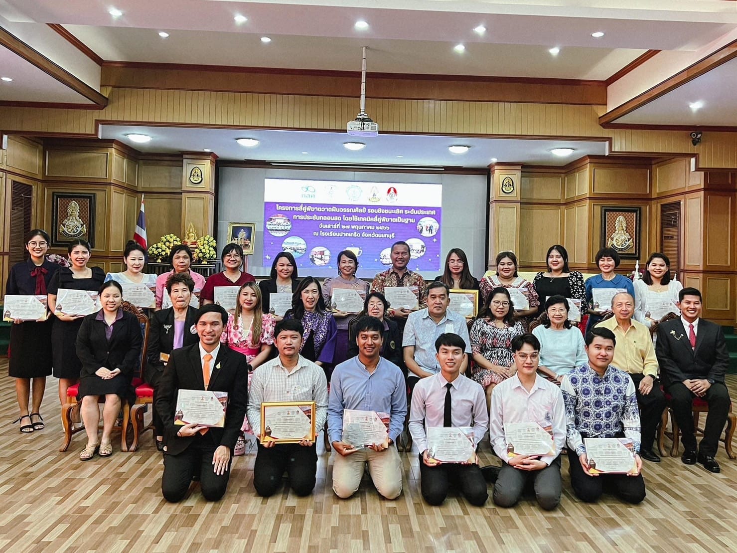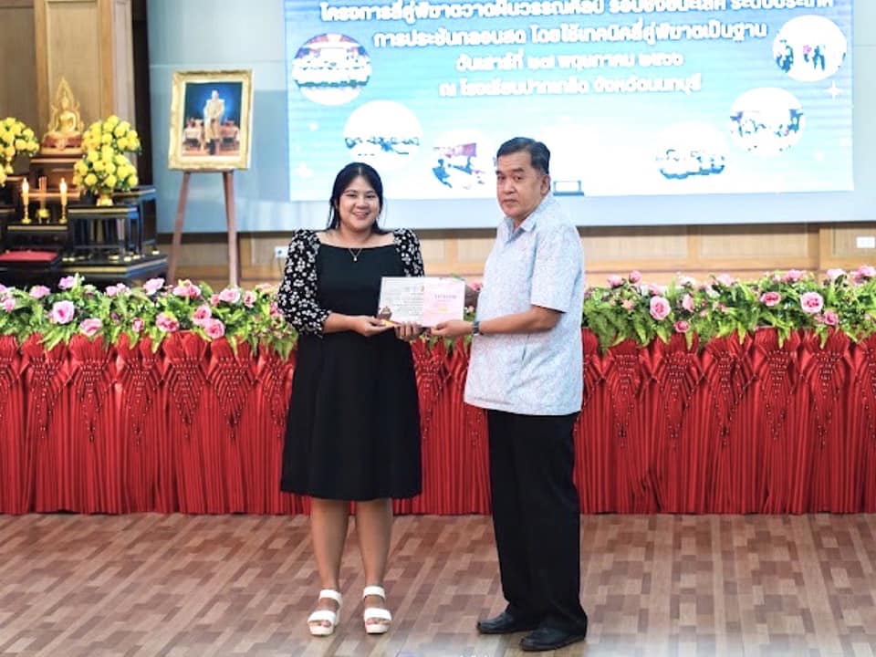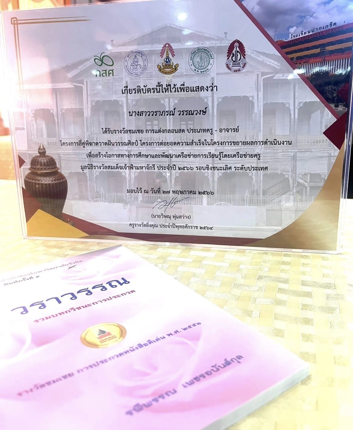 ครูวราภรณ์ วรรณวงษ์ ในโอกาสได้รับรางวัลชมเชย การแต่งกลอนสด ประเภทครู-อาจารย์ โครงการสี่คู่พิฆาตวาดฝันวรรณศิลป์ โครงการต่อยอดความสำเร็จในโครงการขยายผลการดำเนินงานเพื่อสร้างโอกาสทางการศึกษาและพัฒนาเครือข่ายการเรียนรู้ โดยเครือข่ายครูมูลนิธิรางวัลสมเด็จเจ้าฟ้ามหาจักรี ประจำปี 2566 รอบชิงชนะเลิศ ระดับประเทศ ณ โรงเรียนปากเกร็ด จ.นนทบุรี เมื่อวันที่ 27 พฤษภาคม