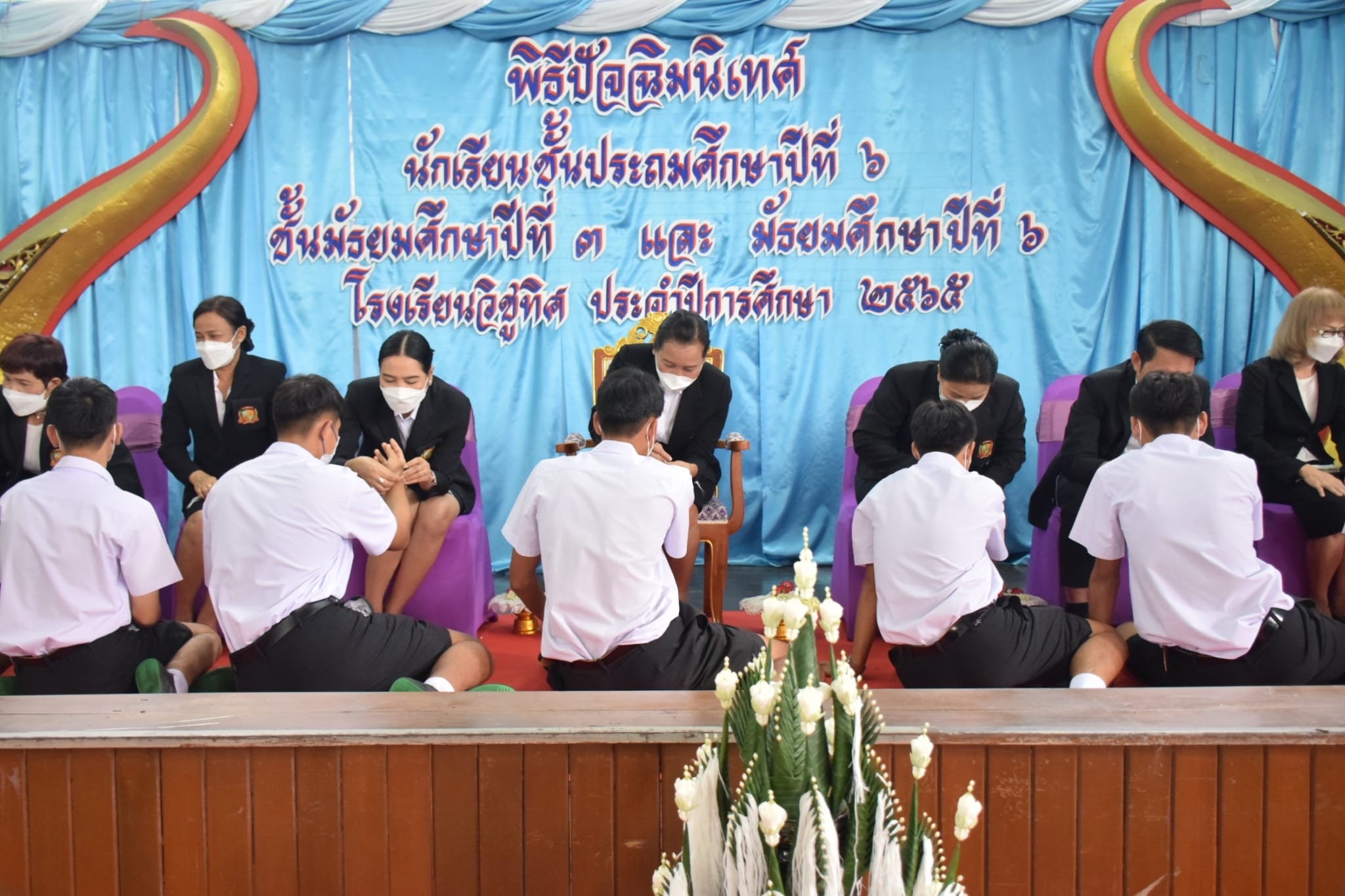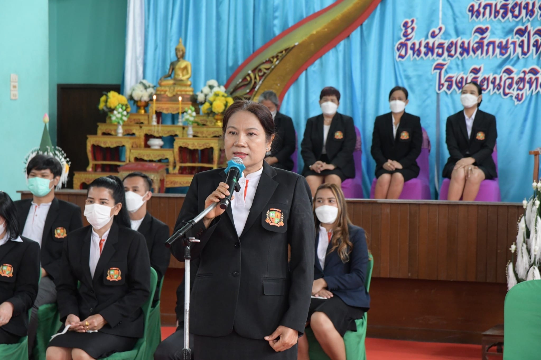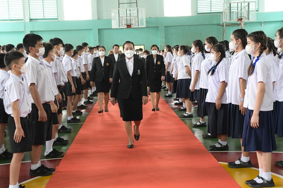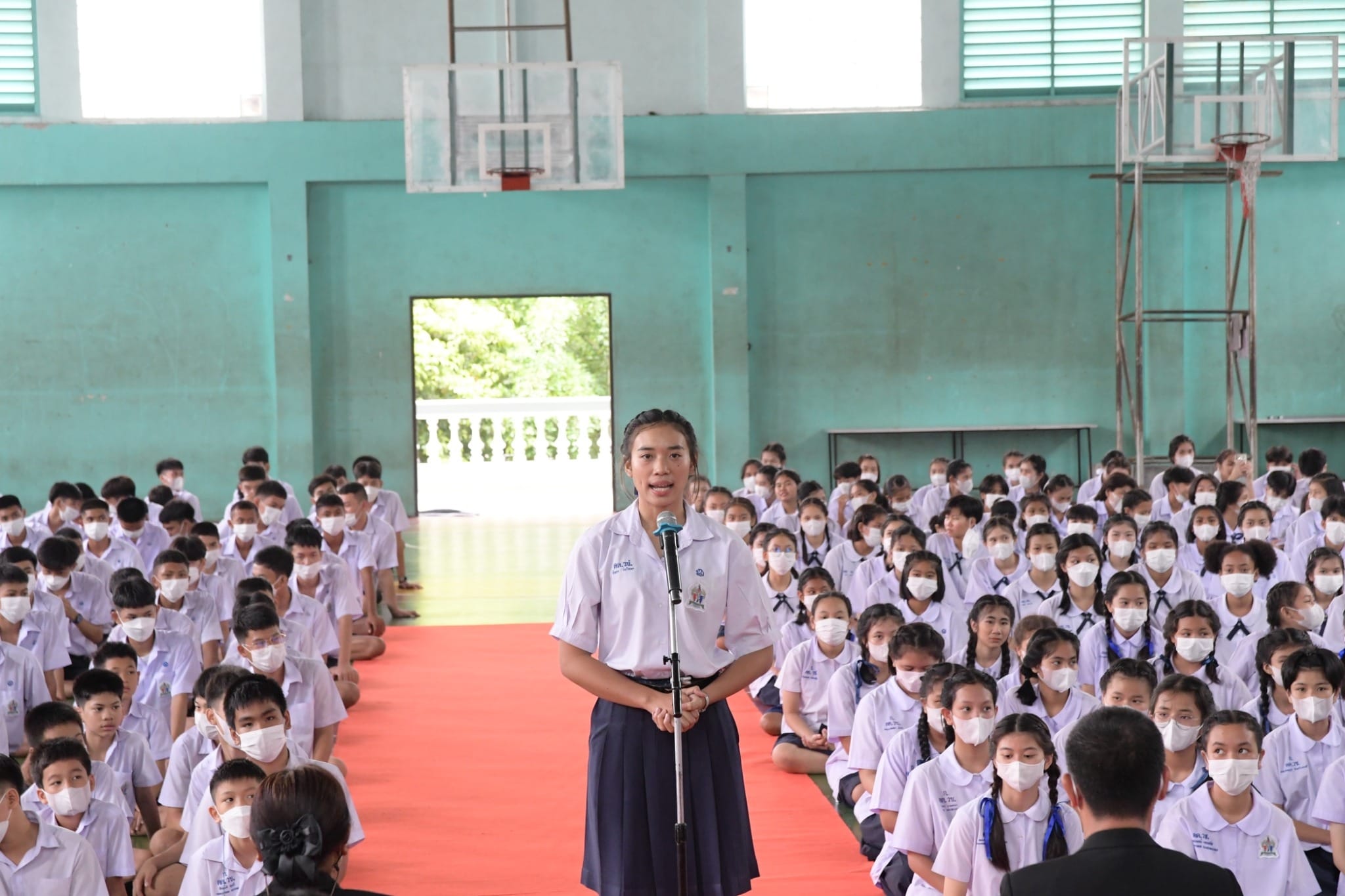 ท่าน ผอ.ธนรา สิรธำรงเลิศ ประธานในพิธีปัจฉิมนิเทศและรับประกาศนียบัตรของนักเรียนชั้น ป.6, ม.3 และ ม.6 ประจำปีการศึกษา 2565 โดยมีท่านรองฯ และคณะครูเป็นเกียรติในพิธี
